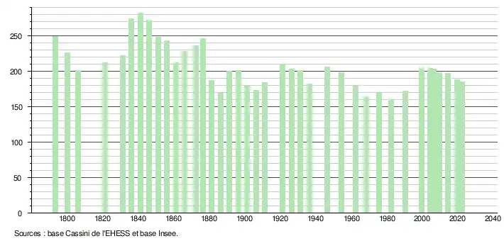 L'évolution du nombre d'habitants est connue à travers les recensements de la population effectués dans la commune depuis 1793. Pour les communes de moins de 10 000 habitants, une enquête de recensement portant sur toute la population est réalisée tous les cinq ans, les populations de référence des années intermédiaires étant quant à elles estimées par interpolation ou extrapolation[26]. Pour la commune, le premier recensement exhaustif entrant dans le cadre du nouveau dispositif a été réalisé en 2004[27].