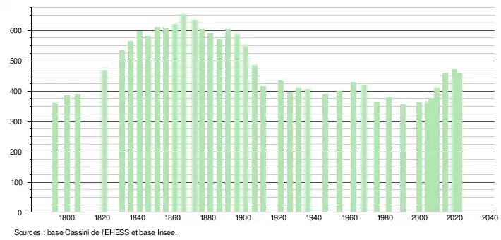 L'évolution du nombre d'habitants est connue à travers les recensements de la population effectués dans la commune depuis 1793. Pour les communes de moins de 10 000 habitants, une enquête de recensement portant sur toute la population est réalisée tous les cinq ans, les populations de référence des années intermédiaires étant quant à elles estimées par interpolation ou extrapolation[34]. Pour la commune, le premier recensement exhaustif entrant dans le cadre du nouveau dispositif a été réalisé en 2004[35].