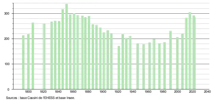 L'évolution du nombre d'habitants est connue à travers les recensements de la population effectués dans la commune depuis 1793. Pour les communes de moins de 10 000 habitants, une enquête de recensement portant sur toute la population est réalisée tous les cinq ans, les populations de référence des années intermédiaires étant quant à elles estimées par interpolation ou extrapolation[17]. Pour la commune, le premier recensement exhaustif entrant dans le cadre du nouveau dispositif a été réalisé en 2006[18].