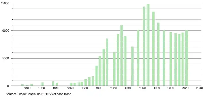 L'évolution du nombre d'habitants est connue à travers les recensements de la population effectués dans la commune depuis 1793. Pour les communes de plus de 10 000 habitants les recensements ont lieu chaque année à la suite d'une enquête par sondage auprès d'un échantillon d'adresses représentant 8 % de leurs logements, contrairement aux autres communes qui ont un recensement réel tous les cinq ans[27],[Note 6].