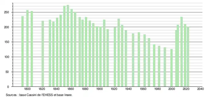 L'évolution du nombre d'habitants est connue à travers les recensements de la population effectués dans la commune depuis 1793. Pour les communes de moins de 10 000 habitants, une enquête de recensement portant sur toute la population est réalisée tous les cinq ans, les populations de référence des années intermédiaires étant quant à elles estimées par interpolation ou extrapolation[36]. Pour la commune, le premier recensement exhaustif entrant dans le cadre du nouveau dispositif a été réalisé en 2008[37].