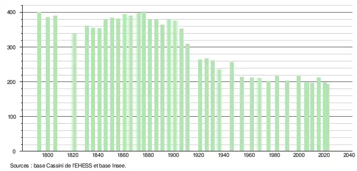 - ↑ Fiches Insee - Populations de référence de la commune pour les années 2006, 2007, 2008, 2009, 2010, 2011, 2012, 2013, 2014, 2015, 2016, 2017, 2018, 2019, 2020, 2021 et 2022.