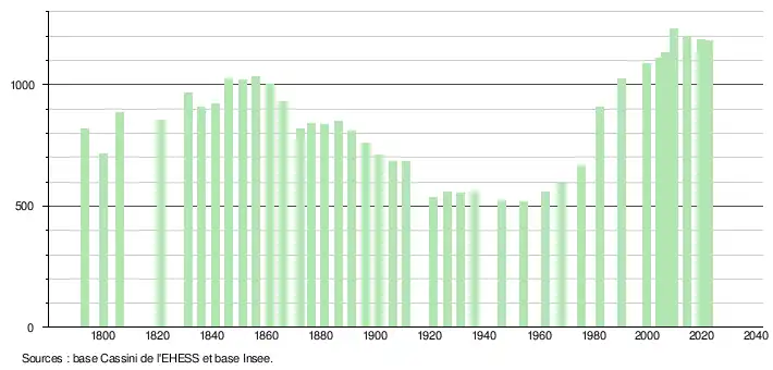 L'évolution du nombre d'habitants est connue à travers les recensements de la population effectués dans la commune depuis 1793. Pour les communes de moins de 10 000 habitants, une enquête de recensement portant sur toute la population est réalisée tous les cinq ans, les populations de référence des années intermédiaires étant quant à elles estimées par interpolation ou extrapolation[15]. Pour la commune, le premier recensement exhaustif entrant dans le cadre du nouveau dispositif a été réalisé en 2004[16].
