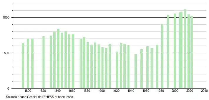 L'évolution du nombre d'habitants est connue à travers les recensements de la population effectués dans la commune depuis 1793. Pour les communes de moins de 10 000 habitants, une enquête de recensement portant sur toute la population est réalisée tous les cinq ans, les populations de référence des années intermédiaires étant quant à elles estimées par interpolation ou extrapolation[33]. Pour la commune, le premier recensement exhaustif entrant dans le cadre du nouveau dispositif a été réalisé en 2008[34].