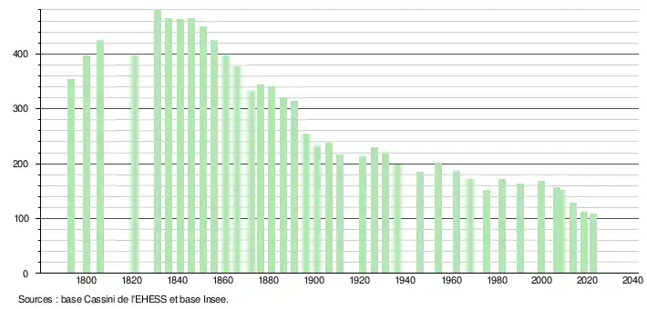 L'évolution du nombre d'habitants est connue à travers les recensements de la population effectués dans la commune depuis 1793. Pour les communes de moins de 10 000 habitants, une enquête de recensement portant sur toute la population est réalisée tous les cinq ans, les populations de référence des années intermédiaires étant quant à elles estimées par interpolation ou extrapolation[16]. Pour la commune, le premier recensement exhaustif entrant dans le cadre du nouveau dispositif a été réalisé en 2008[17].