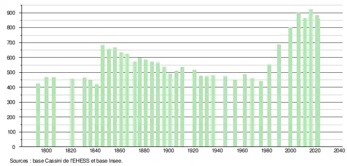 L'évolution du nombre d'habitants est connue à travers les recensements de la population effectués dans la commune depuis 1793. Pour les communes de moins de 10 000 habitants, une enquête de recensement portant sur toute la population est réalisée tous les cinq ans, les populations de référence des années intermédiaires étant quant à elles estimées par interpolation ou extrapolation[18]. Pour la commune, le premier recensement exhaustif entrant dans le cadre du nouveau dispositif a été réalisé en 2006[19].