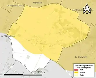 Le retrait-gonflement des sols argileux est susceptible d'engendrer des dommages importants aux bâtiments en cas d’alternance de périodes de sécheresse et de pluie. 82,5 % de la superficie communale est en aléa moyen ou fort (67,4 % au niveau départemental et 48,5 % au niveau national). Sur les 103 bâtiments dénombrés sur la commune en 2019, 102 sont en aléa moyen ou fort, soit 99 %, à comparer aux 81 % au niveau départemental et 54 % au niveau national. Une cartographie de l'exposition du territoire national au retrait gonflement des sols argileux est disponible sur le site du BRGM[17],[Carte 3].