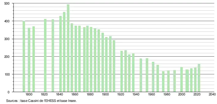 L'évolution du nombre d'habitants est connue à travers les recensements de la population effectués dans la commune depuis 1793. Pour les communes de moins de 10 000 habitants, une enquête de recensement portant sur toute la population est réalisée tous les cinq ans, les populations de référence des années intermédiaires étant quant à elles estimées par interpolation ou extrapolation[24]. Pour la commune, le premier recensement exhaustif entrant dans le cadre du nouveau dispositif a été réalisé en 2007[25].