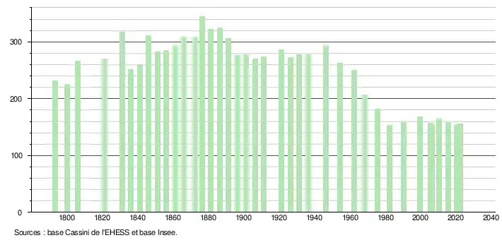 L'évolution du nombre d'habitants est connue à travers les recensements de la population effectués dans la commune depuis 1793. Pour les communes de moins de 10 000 habitants, une enquête de recensement portant sur toute la population est réalisée tous les cinq ans, les populations de référence des années intermédiaires étant quant à elles estimées par interpolation ou extrapolation[21]. Pour la commune, le premier recensement exhaustif entrant dans le cadre du nouveau dispositif a été réalisé en 2005[22].