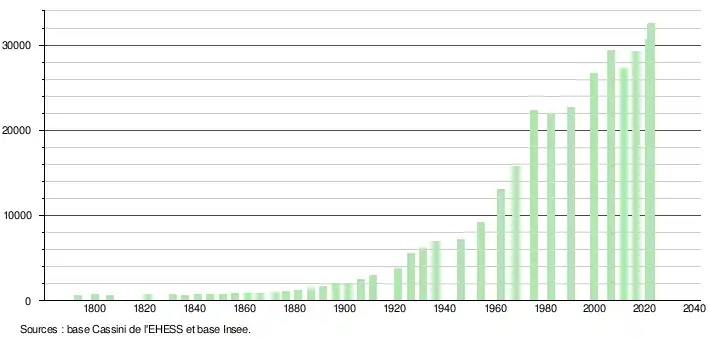 L'évolution du nombre d'habitants est connue à travers les recensements de la population effectués dans la commune depuis 1793. Pour les communes de plus de 10 000 habitants les recensements ont lieu chaque année à la suite d'une enquête par sondage auprès d'un échantillon d'adresses représentant 8 % de leurs logements, contrairement aux autres communes qui ont un recensement réel tous les cinq ans[29],[Note 4].