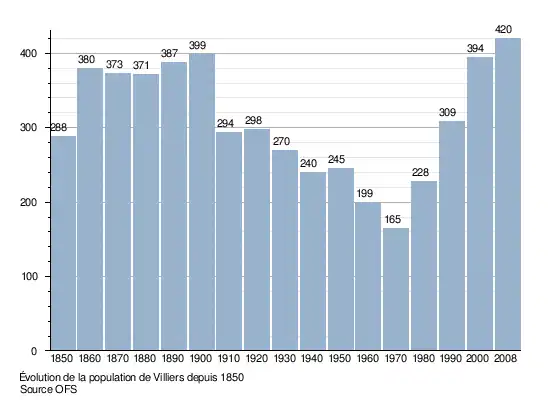 Selon l'Office fédéral de la statistique, Villiers comptait 497 habitants fin 2023[2]. Sa densité de population atteint 47 hab./km2.