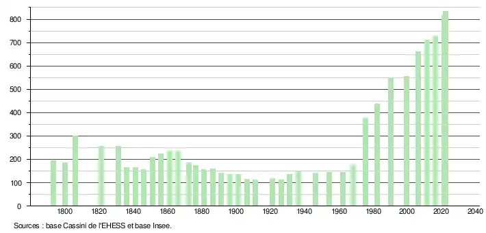 L'évolution du nombre d'habitants est connue à travers les recensements de la population effectués dans la commune depuis 1793. Pour les communes de moins de 10 000 habitants, une enquête de recensement portant sur toute la population est réalisée tous les cinq ans, les populations de référence des années intermédiaires étant quant à elles estimées par interpolation ou extrapolation[23]. Pour la commune, le premier recensement exhaustif entrant dans le cadre du nouveau dispositif a été réalisé en 2006[24].