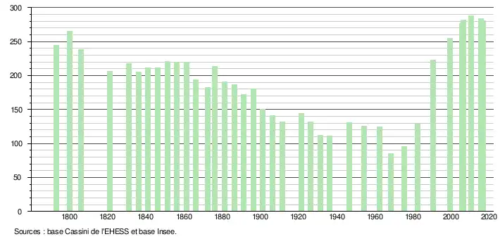 L'évolution du nombre d'habitants est connue à travers les recensements de la population effectués dans la commune depuis 1793. Pour les communes de moins de 10 000 habitants, une enquête de recensement portant sur toute la population est réalisée tous les cinq ans, les populations de référence des années intermédiaires étant quant à elles estimées par interpolation ou extrapolation[5]. Pour la commune, le premier recensement exhaustif entrant dans le cadre du nouveau dispositif a été réalisé en 2005[6].