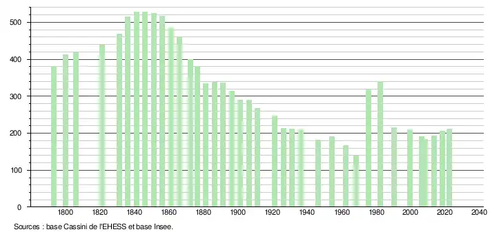 L'évolution du nombre d'habitants est connue à travers les recensements de la population effectués dans la commune depuis 1793. Pour les communes de moins de 10 000 habitants, une enquête de recensement portant sur toute la population est réalisée tous les cinq ans, les populations de référence des années intermédiaires étant quant à elles estimées par interpolation ou extrapolation[24]. Pour la commune, le premier recensement exhaustif entrant dans le cadre du nouveau dispositif a été réalisé en 2008[25].