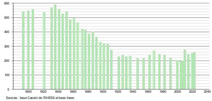 L'évolution du nombre d'habitants est connue à travers les recensements de la population effectués dans la commune depuis 1793. Pour les communes de moins de 10 000 habitants, une enquête de recensement portant sur toute la population est réalisée tous les cinq ans, les populations de référence des années intermédiaires étant quant à elles estimées par interpolation ou extrapolation[18]. Pour la commune, le premier recensement exhaustif entrant dans le cadre du nouveau dispositif a été réalisé en 2004[19].