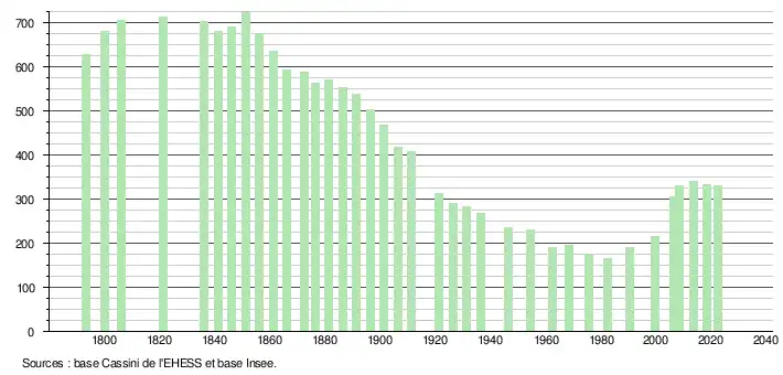 L'évolution du nombre d'habitants est connue à travers les recensements de la population effectués dans la commune depuis 1793. Pour les communes de moins de 10 000 habitants, une enquête de recensement portant sur toute la population est réalisée tous les cinq ans, les populations de référence des années intermédiaires étant quant à elles estimées par interpolation ou extrapolation[19]. Pour la commune, le premier recensement exhaustif entrant dans le cadre du nouveau dispositif a été réalisé en 2008[20].