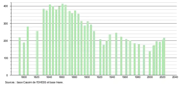 L'évolution du nombre d'habitants est connue à travers les recensements de la population effectués dans la commune depuis 1793. Pour les communes de moins de 10 000 habitants, une enquête de recensement portant sur toute la population est réalisée tous les cinq ans, les populations de référence des années intermédiaires étant quant à elles estimées par interpolation ou extrapolation[28]. Pour la commune, le premier recensement exhaustif entrant dans le cadre du nouveau dispositif a été réalisé en 2005[29].