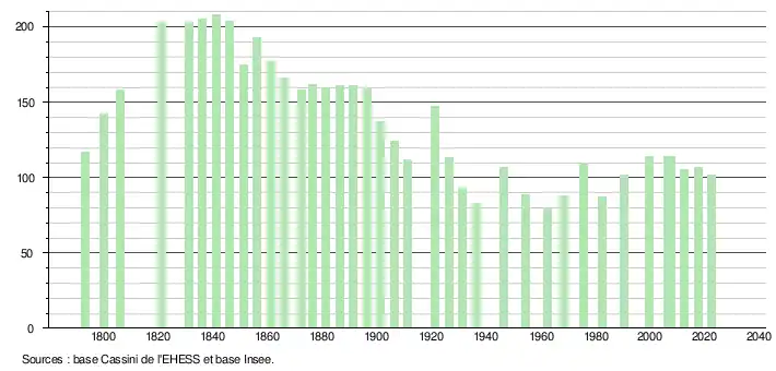 L'évolution du nombre d'habitants est connue à travers les recensements de la population effectués dans la commune depuis 1793. Pour les communes de moins de 10 000 habitants, une enquête de recensement portant sur toute la population est réalisée tous les cinq ans, les populations de référence des années intermédiaires étant quant à elles estimées par interpolation ou extrapolation[14]. Pour la commune, le premier recensement exhaustif entrant dans le cadre du nouveau dispositif a été réalisé en 2007[15].