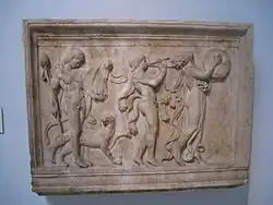 Cette origine religieuse laisse des traces, comme le nom même du théâtre d'Athènes, dédié à Dionysos, ou encore le mot tragédie, qui semble refléter une signification religieuse. On fait habituellement dériver le grec ancien τραγῳδία / tragoidía de τράγος / trágos, « le bouc », et de ᾄδω / áidô, « chanter ». Le mot signifierait donc « chant du bouc »[7]. Le terme tragédie pourrait donc désigner une forme de dithyrambe joué par des acteurs déguisés en satyres et vêtus de peaux de boucs, hypothèse reprise par Aristote[8]. D'autres hypothèses, elles-mêmes défendues par certains auteurs antiques[9], voient en cette évocation du bouc la récompense offerte au gagnant du concours, ou la victime d'un sacrifice effectué à cette occasion[10].