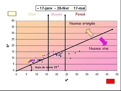 Le dernier point à prendre en compte, est essentiel pour le vinificateur de rosé : il consiste à évaluer le « potentiel couleur de la vendange » qui est variable selon les cépages, et pour un même cépage selon le niveau de maturité et le millésime comme le montre le graphique. Une approche empirique consiste à noter le nombre de nuits fraîches (< 15 °C) en août car l'amplitude thermique jour / nuit est favorable à l'accumulation des anthocyanes dans la pellicule de la baie de raisin[14]. Sur le graphique ci-contre, on notera par exemple le plus faible niveau de la courbe correspondant au millésime 2003, année de canicule en Europe.