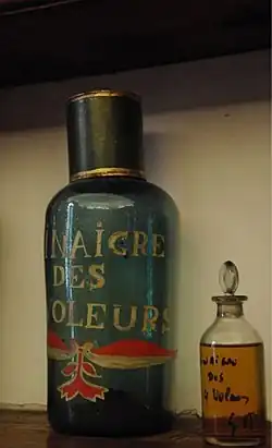 Le vinaigre des quatre voleurs fut inscrit au codex en 1748 et vendu en pharmacie comme antiseptique[1]. Il est cité dans les Mémoires secrets de Bachaumont[2], et dans Le Temps des amours de Marcel Pagnol. Il est encore commercialisé aujourd’hui contre les risques de contagion, soins de la peau, capillaires et des muqueuses, fatigue, maux de tête, encombrement respiratoire, élimination des poux et lentes…[réf. nécessaire]