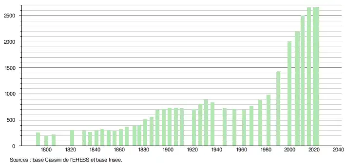 L'évolution du nombre d'habitants est connue à travers les recensements de la population effectués dans la commune depuis 1793. Pour les communes de moins de 10 000 habitants, une enquête de recensement portant sur toute la population est réalisée tous les cinq ans, les populations de référence des années intermédiaires étant quant à elles estimées par interpolation ou extrapolation[36]. Pour la commune, le premier recensement exhaustif entrant dans le cadre du nouveau dispositif a été réalisé en 2005[37].