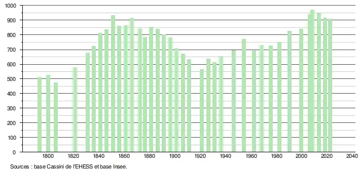 L'évolution du nombre d'habitants est connue à travers les recensements de la population effectués dans la commune depuis 1793. Pour les communes de moins de 10 000 habitants, une enquête de recensement portant sur toute la population est réalisée tous les cinq ans, les populations de référence des années intermédiaires étant quant à elles estimées par interpolation ou extrapolation[23]. Pour la commune, le premier recensement exhaustif entrant dans le cadre du nouveau dispositif a été réalisé en 2008[24].