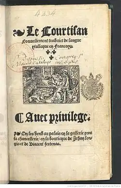 - ↑ Philippe Renouard, Répertoire des imprimeurs parisiens...depuis l'introduction de l'imprimerie à Paris (1470) jusqu'à la fin du XVIe siècle, Paris, Miliard,