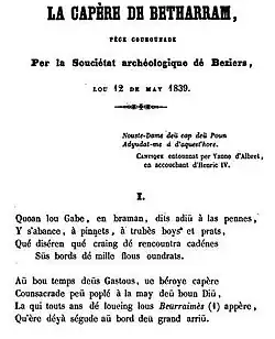 Il composa la première pour le concours organisé par la Société archéologique de Béziers et obtint le premier prix (le Rameau d'argent en l’occurrence). Pour Jean-Marie Sarpoulet, il « fut le premier à ouvrir la littérature béarnaise sur le domaine d'oc en concourant aux Jeux floraux dans son occitan béarnais » [38]. Pau : Vignacour, 1849.