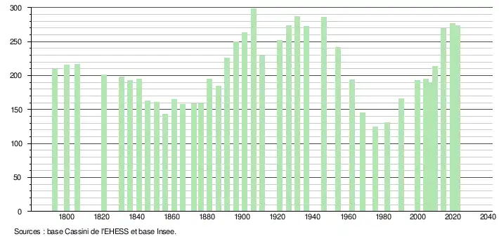 L'évolution du nombre d'habitants est connue à travers les recensements de la population effectués dans la commune depuis 1793. Pour les communes de moins de 10 000 habitants, une enquête de recensement portant sur toute la population est réalisée tous les cinq ans, les populations de référence des années intermédiaires étant quant à elles estimées par interpolation ou extrapolation[39]. Pour la commune, le premier recensement exhaustif entrant dans le cadre du nouveau dispositif a été réalisé en 2004[40].