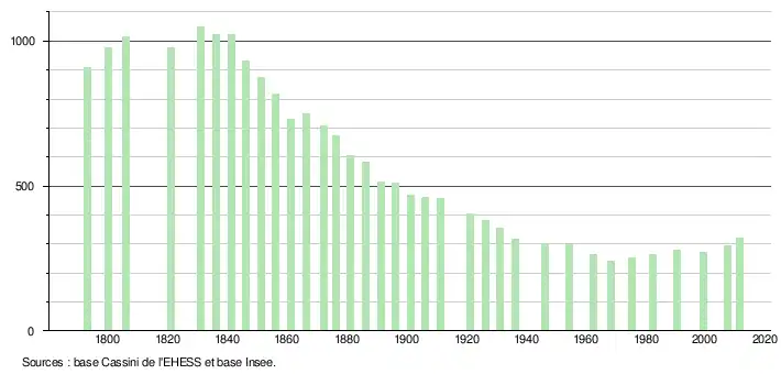 - ↑ Dans le tableau des recensements et le graphique, par convention dans Wikipédia, le principe a été retenu, pour les populations légales postérieures à 1999 de n’afficher dans le tableau des recensements et le graphique que les populations correspondant à l'année 2006, première population légale publiée calculée conformément aux concepts définis dans le décret no 2003-485 du 5 juin 2003, et les années correspondant à une enquête exhaustive de recensement pour les communes de moins de 10 000 habitants, ainsi que la dernière population légale publiée par l’Insee.