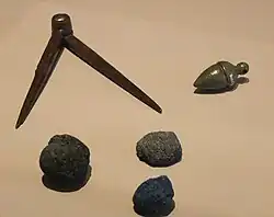 Compas, poids et boules de pigment bleu. Site des Halles.