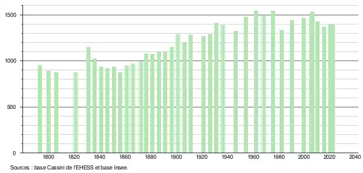 L'évolution du nombre d'habitants est connue à travers les recensements de la population effectués dans la commune depuis 1793. Pour les communes de moins de 10 000 habitants, une enquête de recensement portant sur toute la population est réalisée tous les cinq ans, les populations de référence des années intermédiaires étant quant à elles estimées par interpolation ou extrapolation[29]. Pour la commune, le premier recensement exhaustif entrant dans le cadre du nouveau dispositif a été réalisé en 2005[30].