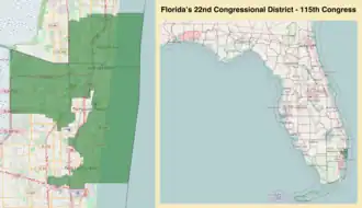 Le 22e district a été le centre de l'élection présidentielle contestée de 2000 en Floride et du redécoupage qui a suivi. De 2017 à 2023, le district englobait le littoral du comté de Broward jusqu'au sud du comté de Palm Beach et comprenait Boca Raton, Fort Lauderdale, Coral Springs et une partie de Pompano Beach. Il comprenait également la Florida Atlantic University et Port Everglades, le troisième port de croisière le plus fréquenté au monde.