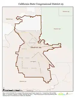 Le Comté de Los Angeles est divisé entre ce district, le 27e district, le 30e district et le 32e district. Les 29e et 27e sont divisés par la Angeles National Forest, Soledad Canyon Road, Southern Pacific Railroad, Sand Canyon Road, Little Tujunga Canyon Road, Santa Clara Truck Trail, Veterans Memorial Park, Golden State Freeway, Devonshire Street, Blue Creek, Chatsworth Street, Balboa Boulevard, Kingsbury Street, Genesta Avenue, Aliso Canyon Wash, and Ronald Reagan Freeway. The 29th and 30th are partitioned by Angeles National Forest, NF-4N35, Gold Creek Road, Big Tujunga Canyon Road, Little Tujunga Road, Longford Street, Clybourne Avenue, Foothill Freeway, Kagel Canyon Street, Osborne Street, Terra Bella Street, Glenoaks Boulevard, Montague Street, San Fernando Road, Branford Street, Tujunga Wash, Wentworth Street, Sheldon Street, Tuxford Street, Sunland Boulevard, Golden State Freeway, Cohasset Street, Sherman Way, Vineland Avenue, Southern Pacific Railroad, Ledge Avenue, West Clark Avenue, North Clybourn Avenue, and the Los Angeles River. Les 27e et 32e sont divisés par la San Diego Freeway, Roscoe Boulevard, Reseda Boulevard, Saticoy Street, Lull Street, Garden Grove Avenue, Valerio Street, Etiwanda Avenue, Gault Street, Victory Boulevard, Oxnard Street, Hazeltine Avenue, Burbank Boulevard, Tujunga Wash, Ventura Freeway, Hollywood Freeway, Whipple Street, and Lankershim Boulevard. Le 27e district englobe la ville de San Fernando et les quartiers de Los Angeles de Van Nuys, Panorama City, Sylmar, Valley Village, Sun Valley, Pacoima, Toluca Lake, Valley Glen, Arleta, Mission Hills une partie de Lake View Terrace, la partie ouest de North Hollywood et le centre de Lake Balboa.
