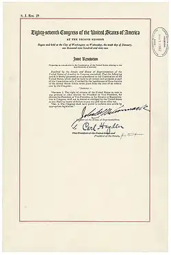 « Article 1. Le droit des citoyens des États-Unis de voter à toute élection primaire ou autre élection du président et du vice-président, des grands électeurs du président et du vice-président, ou des sénateurs et représentants au Congrès, ne sera refusé ou restreint ni par les États-Unis, ni par aucun État, pour cause de non paiement de la taxe électorale ou de tout autre impôt.