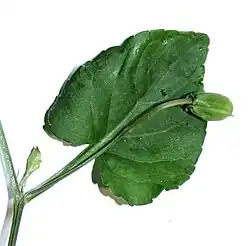Lorsque la fleur[3] est fertilisée, l’éperon se divise en trois[4] pour révéler les semences en forme d’œuf[5]. On trouve parfois des stipules à la base du plant.