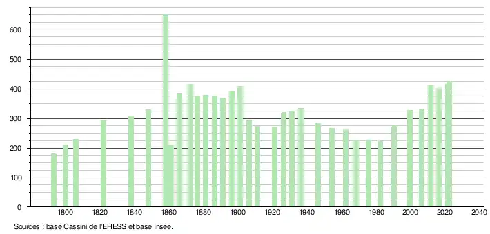 L'évolution du nombre d'habitants est connue à travers les recensements de la population effectués dans la commune depuis 1793. Pour les communes de moins de 10 000 habitants, une enquête de recensement portant sur toute la population est réalisée tous les cinq ans, les populations de référence des années intermédiaires étant quant à elles estimées par interpolation ou extrapolation[10]. Pour la commune, le premier recensement exhaustif entrant dans le cadre du nouveau dispositif a été réalisé en 2006[11].