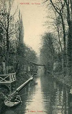 Après être passée grâce à un ouvrage hydraulique sous les voies et le passage à niveau à l'ouest, et avoir longé la gare de Pontoise par le sud, elle passe sous le parking de la gare et coule derrière la résidence « Les Rives de l'Oise » située le long de la voie ferrée, prend la direction plein sud en passant sous le boulevard qui monte vers Cergy (RD 14) et emprunte sur environ 500 m un petit canal latéral à l'Oise qui traverse le parc de l'évêché (voir photo ci-dessus), puis se jette dans l'Oise en aval du barrage de Pontoise.