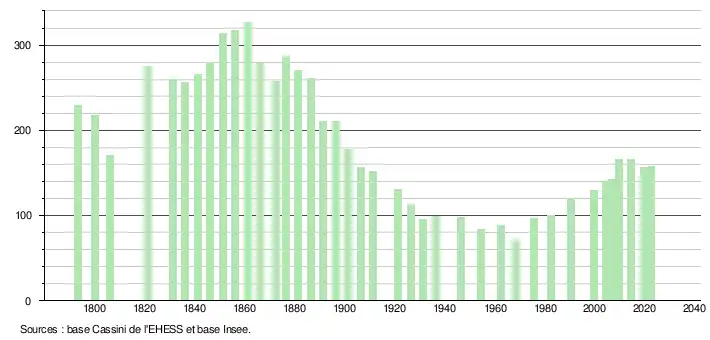 - ↑ Fiches Insee - Populations de référence de la commune pour les années 2006, 2007, 2008, 2009, 2010, 2011, 2012, 2013, 2014, 2015, 2016, 2017, 2018, 2019, 2020, 2021 et 2022.