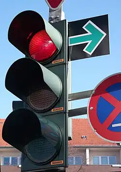 L'article R415-15 du Code de la route modifié par le décret n° 2010-1390 du portant diverses mesures de sécurité routière[3] permet une signalisation distincte, pouvant autoriser conditionnellement le franchissement de l'intersection en apposant sur le feu un panonceau M12a. En Belgique, il s'agit du panneau B22.