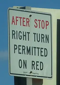 Panneau à l'île de Montréal interdisant de tourner à droite au feu rouge.- Panneau autorisant les bicyclettes à tourner à droite au feu rouge en France et en Belgique.