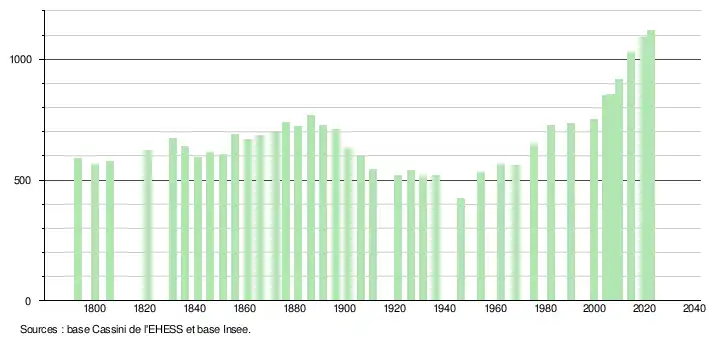 - ↑ Population municipale de référence en vigueur au 1er janvier 2025, millésimée 2022, définie dans les limites territoriales en vigueur au 1er janvier 2024, date de référence statistique : 1er janvier 2022.