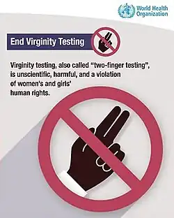 En , les Nations unies et l'organisation mondiale de la santé ont appelé à l'arrêt de ces tests de virginité, car non scientifiques, inutiles, discriminatoires envers les femmes et pouvant se révéler traumatisants, notamment pour les victimes de viol[38].