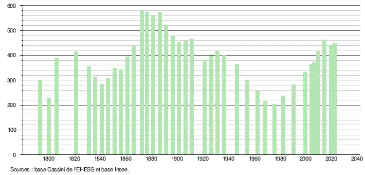 L'évolution du nombre d'habitants est connue à travers les recensements de la population effectués dans la commune depuis 1793. Pour les communes de moins de 10 000 habitants, une enquête de recensement portant sur toute la population est réalisée tous les cinq ans, les populations de référence des années intermédiaires étant quant à elles estimées par interpolation ou extrapolation[12]. Pour la commune, le premier recensement exhaustif entrant dans le cadre du nouveau dispositif a été réalisé en 2004[13].