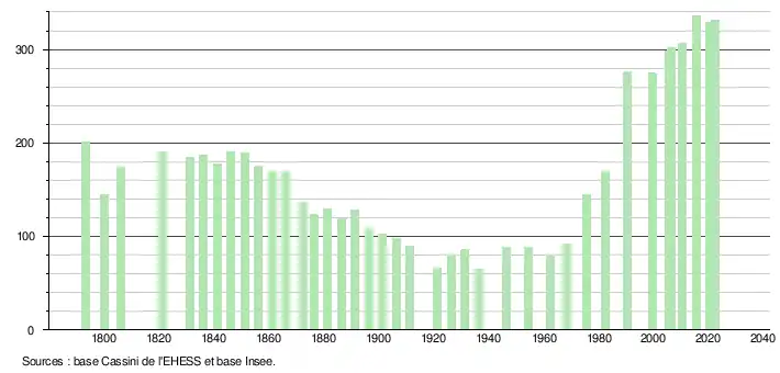 L'évolution du nombre d'habitants est connue à travers les recensements de la population effectués dans la commune depuis 1793. Pour les communes de moins de 10 000 habitants, une enquête de recensement portant sur toute la population est réalisée tous les cinq ans, les populations de référence des années intermédiaires étant quant à elles estimées par interpolation ou extrapolation[22]. Pour la commune, le premier recensement exhaustif entrant dans le cadre du nouveau dispositif a été réalisé en 2005[23].