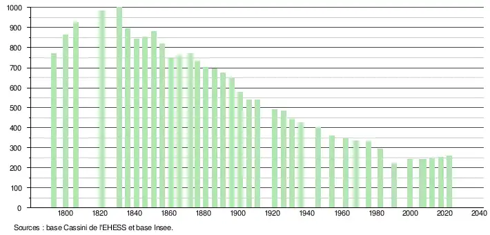 L'évolution du nombre d'habitants est connue à travers les recensements de la population effectués dans la commune depuis 1793. Pour les communes de moins de 10 000 habitants, une enquête de recensement portant sur toute la population est réalisée tous les cinq ans, les populations de référence des années intermédiaires étant quant à elles estimées par interpolation ou extrapolation[13]. Pour la commune, le premier recensement exhaustif entrant dans le cadre du nouveau dispositif a été réalisé en 2007[14].