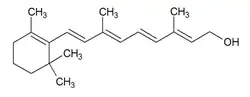 La vitamine A est une vitamine importante pour la vision. Grâce à ses différentes formes (rétinol/rétinal all-trans/9-cis/11-cis ; correspondantes à une isomérie de la chaîne isoprénique) aussi appelés vitamères, elle intervient pour former une photopile dans les cellules nerveuses de l'œil : les bâtonnets. Avec l'opsine, le rétinal 11-cis forme la rhodopsine où l'atome d'oxygène est remplacé par un azote protoné lié au reste de la protéine. Les doubles liaisons forment un système conjugué qui absorbe un photon pour se déplier, devenant tous-trans. Le proton lié à l'azote au bout du système conjugué est alors transporté à travers la protéine et déclenche l'influx nerveux. La protéine devient la métarhodopsine II qui se dissocie en opsine et en rétinal all-trans. Après action d'une enzyme appelée déshydrogénase, le rétinal all trans est transformé en rétinol all trans, subit l'action d'une isomérase et enfin d'une seconde déshydrogénase, pour redonner du rétinal 11-cis et boucler ainsi le cycle visuel.