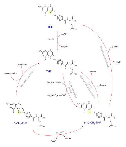 Pour jouer un rôle métabolique actif, l'acide folique doit être transformé en dihydrofolate (FH2), puis en tétrahydrofolate (THF), c'est-à-dire réduits (hydrogénés) par la folate réductase et la dihydrofolate réductase respectivement.
