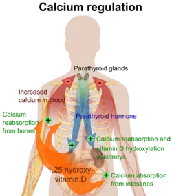La parathormone (PTH) stimule l'expression du gène de l'enzyme 1-alpha-hydroxylase. Elle favorise l'hydroxylation sur le carbone no 1 et donc stimule la production de la forme active de la vitamine D (1-25-dihydroxy-vitamine D). En revanche, l'absence de PTH favorise une hydroxylation différente qui ne permet pas d'avoir la forme active. Elle se fait (au niveau du rein) sur le carbone 24 par l'enzyme 24-hydroxylase, ce qui donne le 24,25-dihydroxy-cholécalciférol moins actif que le 1,25-dihydroxycholecalciferol[31]. La calcitonine diminue les taux sanguins de calcium et s'oppose aux effets de la parathormone[32].